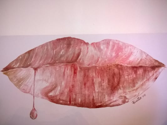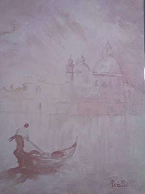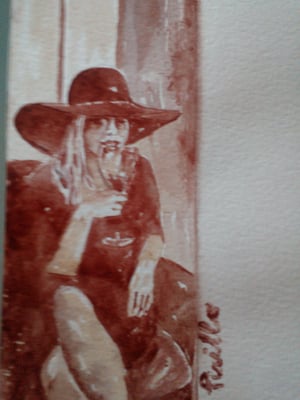 Maria Teresa Pirillo e’ un ‘artista calabrese che vive in Friuli e con il vino del suo paese, il Ciro’, ha disegnato questa sua opera. La caratteristica di questo lavoro e’ appunto “il vinarello”, insomma l’acquerello usando il vino, nel caso della Pirillo il rosso rubino che offre un aspetto vivo e gioioso. L’autoritratto, come sempre vuole l’autrice nei suoi disegni, vorrebbe cogliere anche gli aspetti psicologici, disegnare insomma la personalità di chi dipinge. L’artista infatti e’ generosa e passionale e lo registra anche nel suo tessuto segnico.Peraltro uscendo dal personale ci troviamo di fronte ad un’autrice che predilige il paesaggio e la narrazione, per cui quasi un racconto si sfila nelle sue mani che disegnano e sedimentano le architetture con brevi tracce. Maria Teresa Pirillo e’ una figlia della Calabria -e quindi del sud- che si fa onore al nord con un indomito carattere e una sensibilità raffinata. Sul versante artistico forse e’ più’ incline al disegno e meno al colore, ma comunque quando lavora con gli effetti cromatici consegue risultati di pienezza e di godibilità indiscutibile. Nostalgica della sua terra, da donna del sud vive il nord con consapevolezza e coraggio, sapendone apprezzare i risvolti positivi ma non ignorando mai le sue radici e la sua civiltà intensamente mediterranea.
